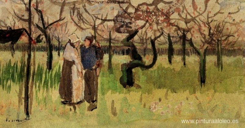 Te ofrecemos una reproducción artesanal en lienzo de la famosa obra de arte 'Huerto en flor con dos figuras Primavera' de Vincent van Gogh, del Museo de Reproducción.