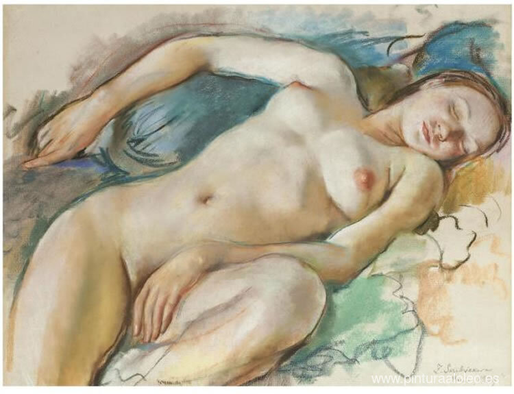 Te ofrecemos una reproducción artesanal en lienzo de la famosa obra de arte 'Desnudo reclinado ' de Zinaida Serebriakova, del Museo de Reproducción.