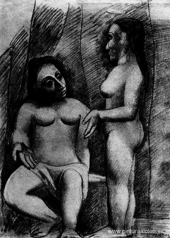 Te ofrecemos una reproducción artesanal en lienzo de la famosa obra de arte 'Desnudo sentado y desnudo de pie' de Pablo Picasso, del Museo de Reproducción.