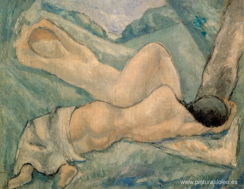Te ofrecemos una reproducción artesanal en lienzo de la famosa obra de arte 'Mujeres desnudas en un paisaje.' de Arturo Souto, del Museo de Reproducción.