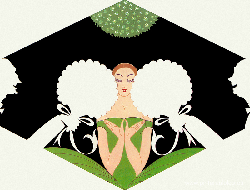 Te ofrecemos una reproducción artesanal en lienzo de la famosa obra de arte 'Los pretendientes' de Erte, del Museo de Reproducción.