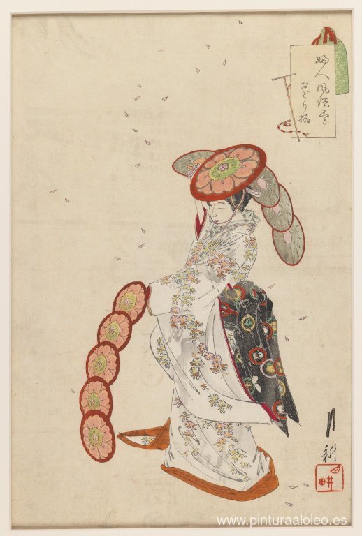 Te ofrecemos una reproducción artesanal en lienzo de la famosa obra de arte 'Bailarina Odori' de Ogata Gekko, del Museo de Reproducción.