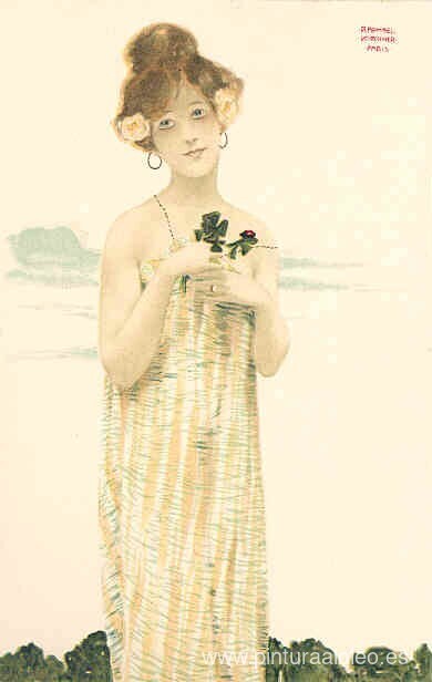 Te ofrecemos una reproducción artesanal en lienzo de la famosa obra de arte 'Chicas con amuletos de buena suerte.' de Raphael Kirchner, del Museo de Reproducción.