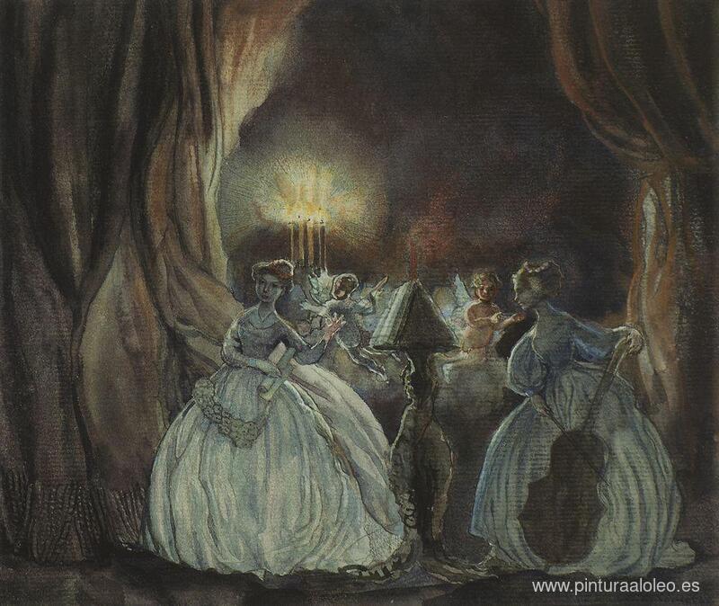 Te ofrecemos una reproducción artesanal en lienzo de la famosa obra de arte 'Concierto' de Konstantin Somov, del Museo de Reproducción.