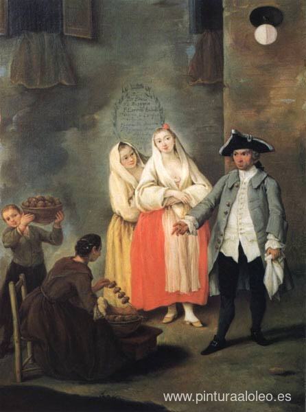 Te ofrecemos una reproducción artesanal en lienzo de la famosa obra de arte 'El vendedor de buñuelos' de Pietro Longhi, del Museo de Reproducción.