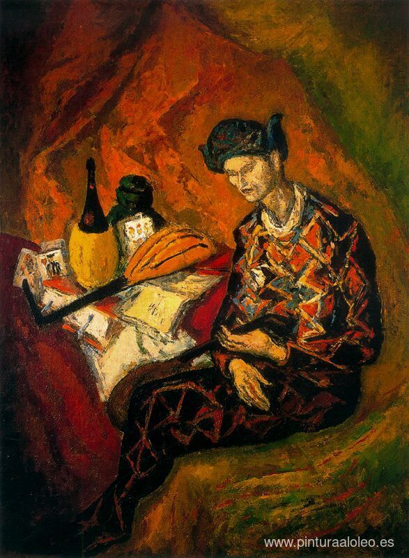 Te ofrecemos una reproducción artesanal en lienzo de la famosa obra de arte 'Naturaleza muerta con Arlequín' de Arturo Souto, del Museo de Reproducción.
