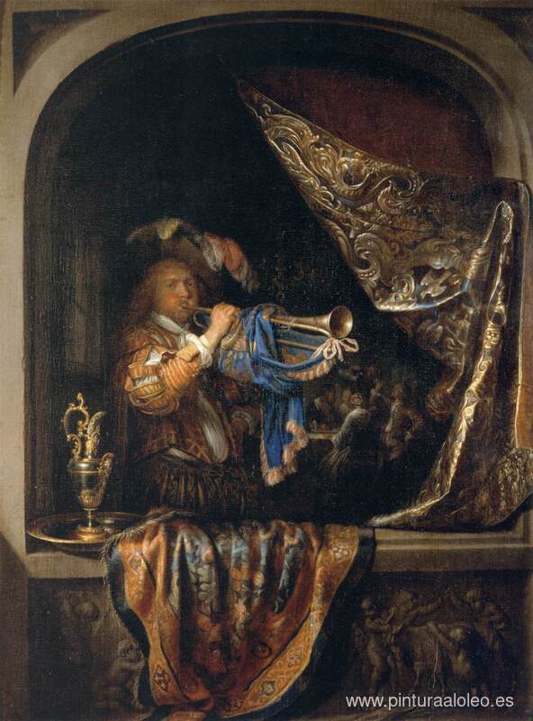 Te ofrecemos una reproducción artesanal en lienzo de la famosa obra de arte 'Trompetista frente a un banquete' de Gerrit Dou, del Museo de Reproducción.