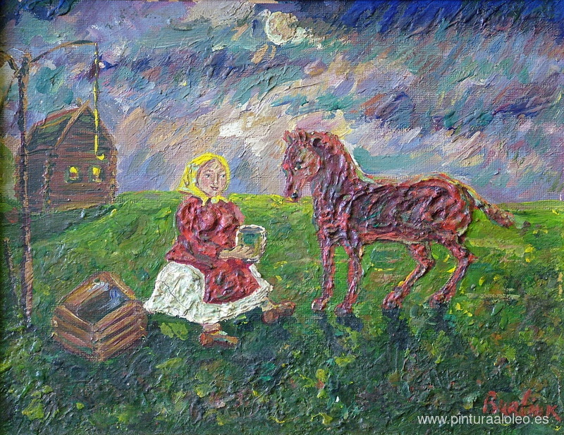 Te ofrecemos una reproducción artesanal en lienzo de la famosa obra de arte 'Una niña abrevando caballo' de David Burliuk, del Museo de Reproducción.
