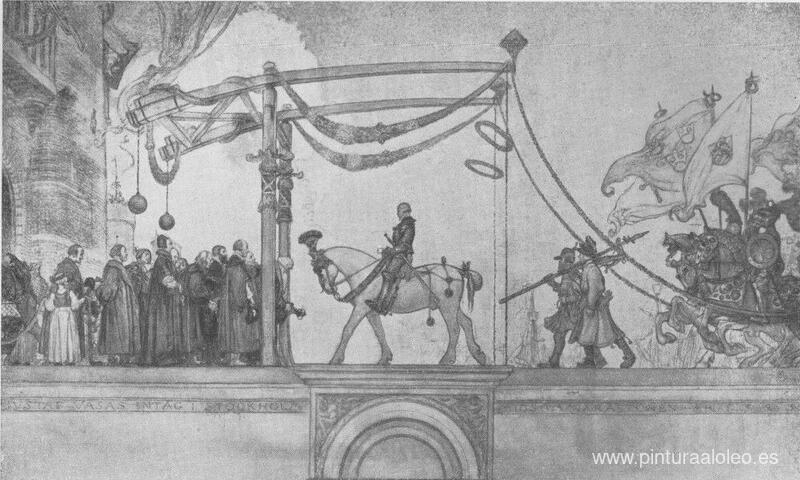 Te ofrecemos una reproducción artesanal en lienzo de la famosa obra de arte 'La entrada del rey Gustav Vasa de Suecia en Estocolmo, 1523' de Carl Larsson, del Museo de Reproducción.