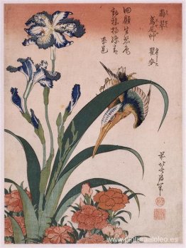 Dos golondrinas en vuelo, rama de sauce y cerezo en flor arriba