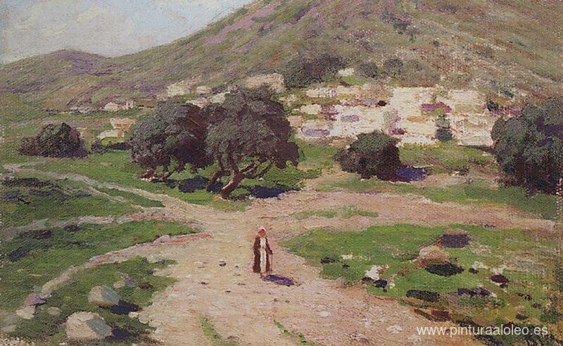 Te ofrecemos una reproducción artesanal en lienzo de la famosa obra de arte 'Al pie de la montaña' de Vasily Polenov, del Museo de Reproducción.
