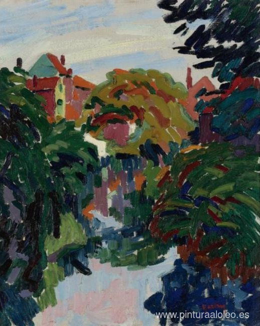 Te ofrecemos una reproducción artesanal en lienzo de la famosa obra de arte 'Casa en el agua' de Auguste Herbin, del Museo de Reproducción.