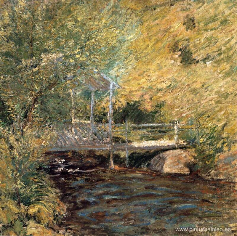 Te ofrecemos una reproducción artesanal en lienzo de la famosa obra de arte 'El pequeño puente' de John Henry Twachtman, del Museo de Reproducción.