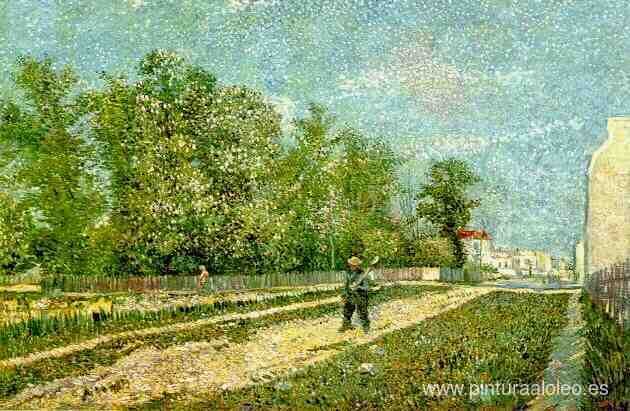Te ofrecemos una reproducción artesanal en lienzo de la famosa obra de arte 'Suburbios de París' de Vincent van Gogh, del Museo de Reproducción.