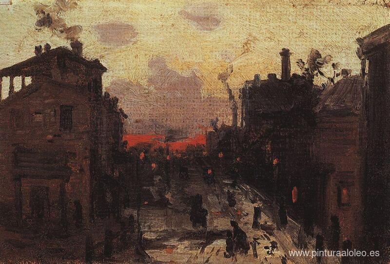 Te ofrecemos una reproducción artesanal en lienzo de la famosa obra de arte 'Atardecer en las afueras del pueblo' de Konstantin Korovin, del Museo de Reproducción.