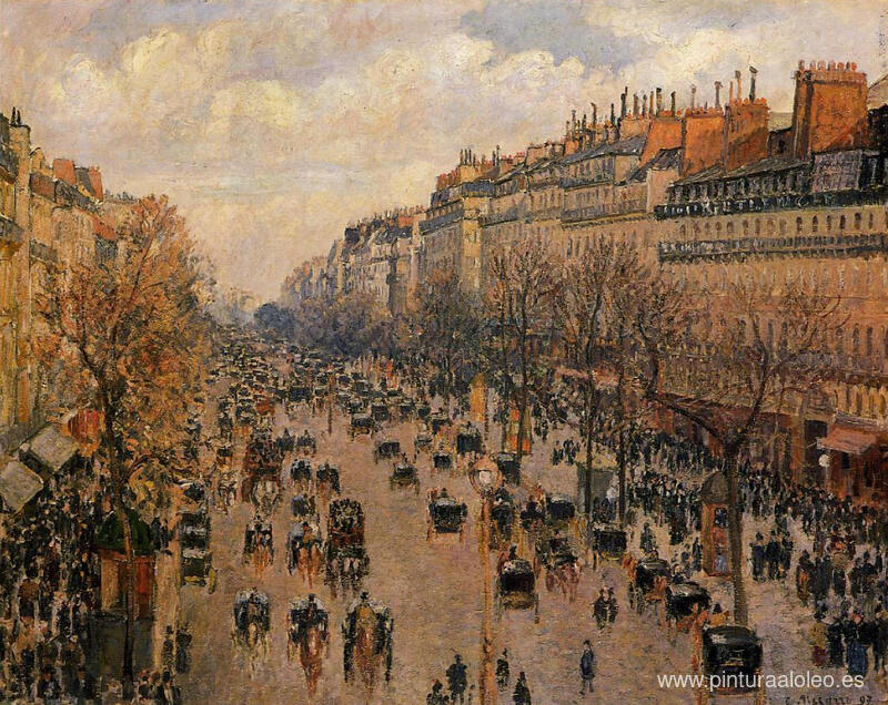 Te ofrecemos una reproducción artesanal en lienzo de la famosa obra de arte 'Boulevard Montmartre Tarde, Luz del sol' de Camille Pissarro, del Museo de Reproducción.
