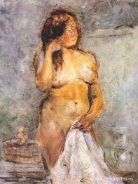Bañista de pie, secándose el pelo