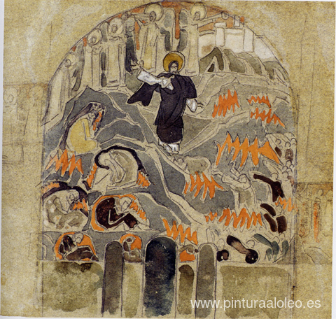 Te ofrecemos una reproducción artesanal en lienzo de la famosa obra de arte 'Desgarrador del infierno' de Nicholas Roerich, del Museo de Reproducción.