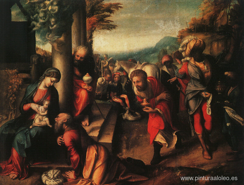 Te ofrecemos una reproducción artesanal en lienzo de la famosa obra de arte 'La Adoración de los Reyes Magos' de Correggio, del Museo de Reproducción.