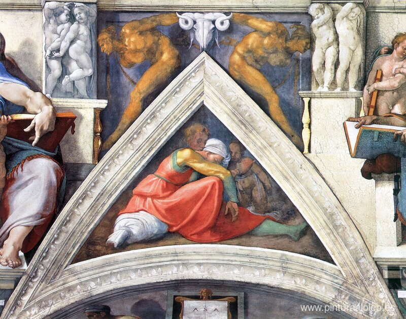 Te ofrecemos una reproducción artesanal en lienzo de la famosa obra de arte 'Los Ancestros de Cristo: Asa' de Michelangelo, del Museo de Reproducción.