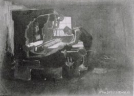 Camino con hombres caminando, carruaje, ciprés, estrella y luna